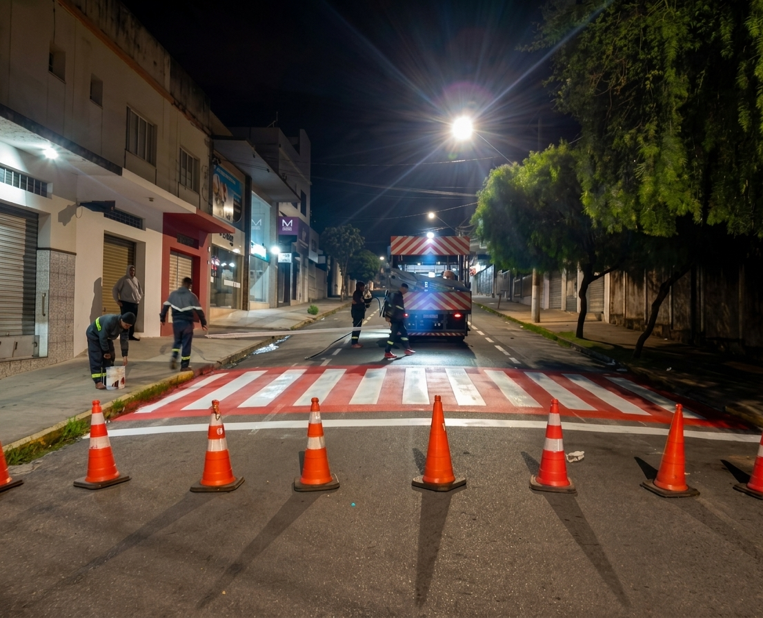 Pela primeira vez na história do município, o serviço está sendo executado por empresa terceirizada, com recursos vinculados ao trânsito. Os resultados já podem ser observados na região central, onde foram reforçadas as pinturas de faixas de pedestres, demarcações de vagas e áreas destinadas ao estacionamento de motocicletas.